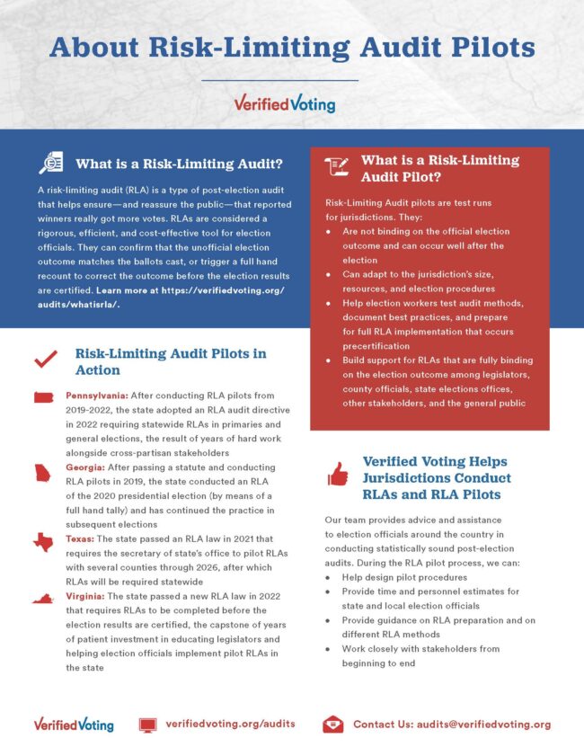 Verified Voting’s downloadable resource on what risk-limiting audit pilots are and how Verified Voting helps jurisdictions across the country conduct them.